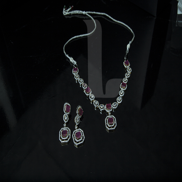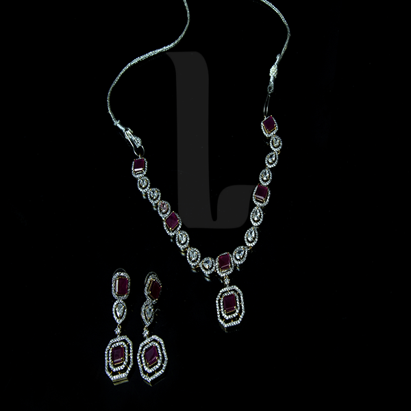 This ruby inspired set has square cut big sized zircons in combination with white zircons. Equally eye-catching ear-rings.